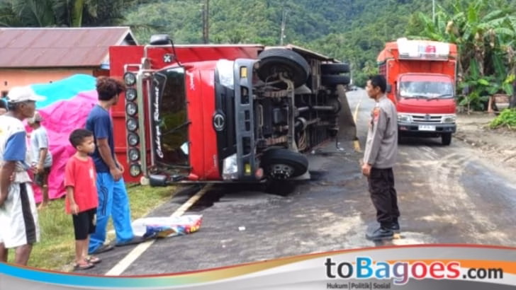 Saat melintas di jalur menanjak dan berliku di kawasan Tubo Apoang, as roda belakang truk tiba-tiba patah, menyebabkan pengemudi kehilangan kendali dan kendaraan terguling ke sisi kiri jalan.