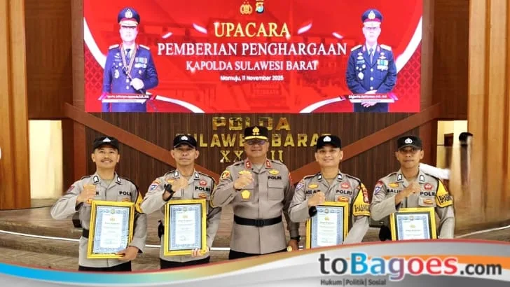 Majene, toBagoes Sulbar – Dalam suasana khidmat dan penuh makna, Aula Marannu Mapolda Sulawesi Barat menjadi saksi pelaksanaan upacara pemberian penghargaan kepada para personel TNI-Polri berprestasi, Selasa (11/11/2025).