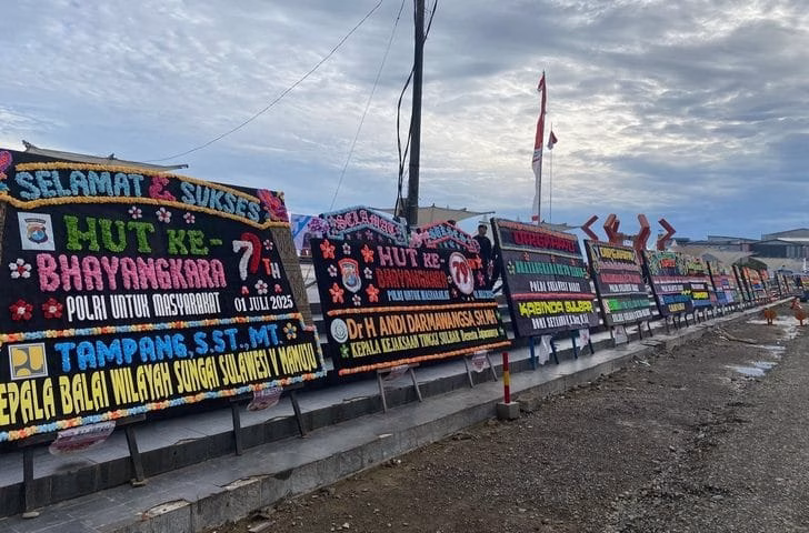 Mamuju, toBagoes Sulbar – Puluhan karangan bunga ucapan selamat Hari Bhayangkara ke-79 memenuhi Anjungan Pantai Manakarra, Selasa (1/7/25), menandai puncak perayaan HUT ke-79 Polri di Sulawesi Barat.