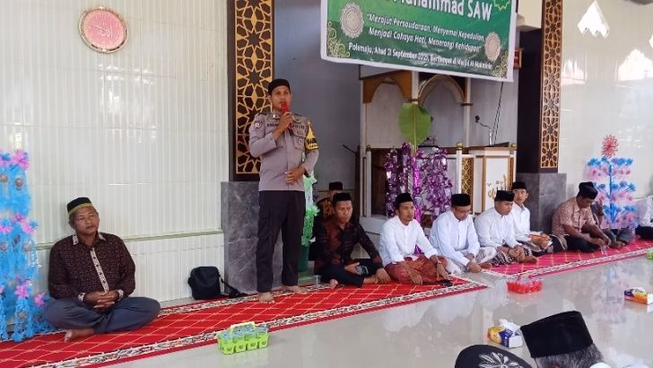 “Bhabinkamtibmas mengajak jamaah meneladani akhlak Rasulullah dalam kehidupan sehari-hari, memperkuat ukhuwah islamiyah, menjaga kerukunan, serta waspada terhadap potensi gangguan Kamtibmas,” ujar IPTU Yauri Yusuf.