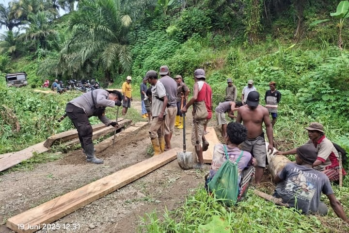 Pasangkayu, toBagoes Sulbar – Pasca Hujan Deras Bhabinkamtibmas Polsek Pasangkayu Polres Pasangkayu Polda Sulbar Bripka Gerson Tolan, bersama warga gotong royong perbaiki jembatan penghubung jalan Dusun Waisuba – Desa Ngovi, Kabupaten Pasangkayu Provinsi Sulawesi Barat, Jumat (20/6/2025)