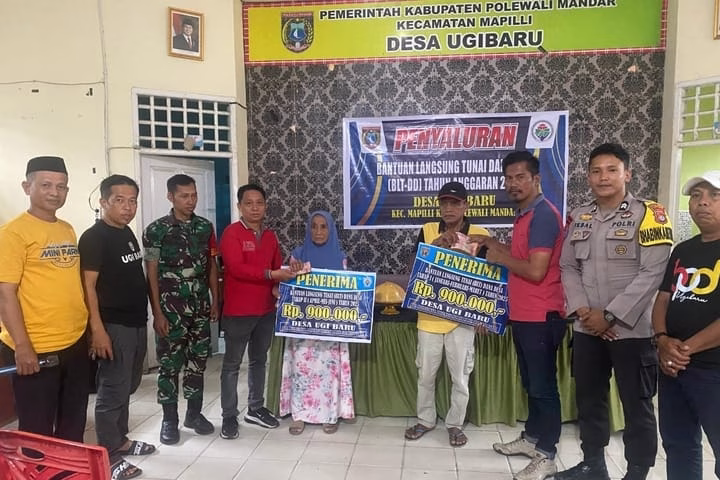 Polewali Mandar, toBagoes Sulbar – Bhabinkamtibmas Desa Ugi Baru Briptu Ikbal Polsek Wonomulyo, Polres Polman menghadiri kegiatan penyaluran Bantuan Langsung Tunai (BLT) Dana Desa Triwulan I Tahun 2025 yang dilaksanakan di Aula Kantor Desa Ugi Baru, Kecamatan Wonomulyo. Jumat (20/06/25)