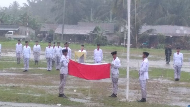 Meski hujan mengguyur deras, masyarakat tetap berdiri tegak. Para guru, pelajar, aparat desa, para kepala desa, hingga warga dari berbagai kalangan hadir dengan wajah penuh bangga. Hening menyelimuti lapangan ketika Sang Merah Putih diturunkan, hanya suara hujan yang jatuh ke tanah menemani momen sakral itu.
