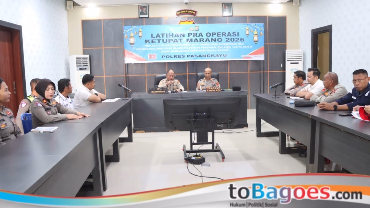 Pasangkayu – Polres Pasangkayu menggelar Latihan Pra Operasi Ketupat Marano 2026 sebagai bentuk kesiapan personel dalam menghadapi pengamanan Hari Raya Idul Fitri 1447 H / 2026 M. Kegiatan tersebut dilaksanakan pada Rabu, 11 Maret 2026 pukul 09.00 WITA bertempat di Aula Rupatama Polres Pasangkayu.