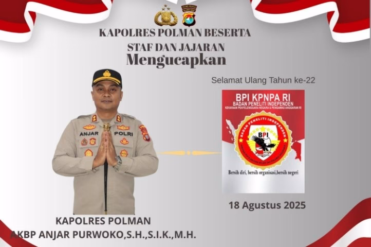 Polewali Mandar, toBagoes Sulbar – Kapolres Polewali Mandar (Polman) AKBP Anjar Purwoko, S.H., S.I.K., M.H., bersama seluruh jajaran menyampaikan ucapan selamat Hari Ulang Tahun Badan Peneliti Independen Kekayaan Penyelenggara Negara dan Pengawas Anggaran Republik Indonesia (BPI KPNPA RI) ke-22 yang diperingati pada 18 Agustus 2025.
