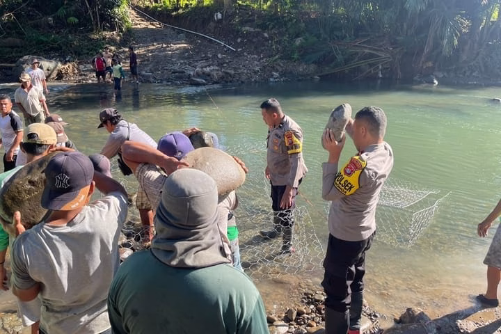 Dengan mengenakan pakaian kerja dan alat sederhana, IPDA Wijaya Sultan tampak bersemangat membantu proses pembangunan jembatan darurat.