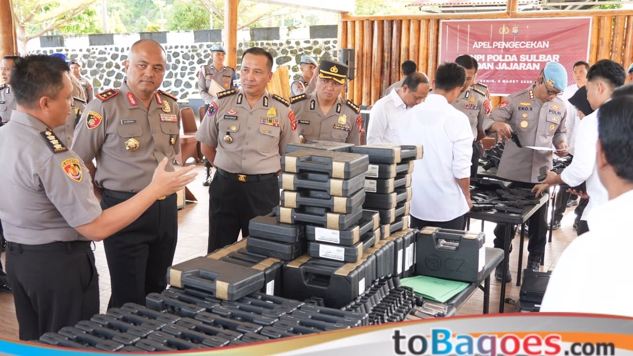 Mamuju – Guna memastikan seluruh senjata api (senpi) organik yang dimiliki dalam keadaan terawat baik dan digunakan secara sesuai aturan oleh personel, Kapolda Sulawesi Barat Irjen Pol Adi Deriyan Jayamarta melakukan pengecekan menyeluruh, Senin (9/3/26) di tribun Mapolda Sulbar.