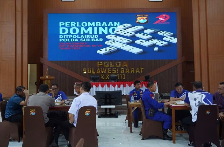 Mamuju, toBagoes Sulbar – Perlombaan Domino turut mewarnai perayaan Hari Ulang Tahun (HUT) Bhayangkara ke-79 di Polda Sulawesi Barat. Nampak kegiatan yang diselenggarakan di Aula Marannu ini dipenuhi semangat keakraban dan persaingan sehat. Lomba domino ini dibuka langsung oleh Kapolda Sulbar, Irjen Pol. Adang Ginanjar, dan diikuti oleh seluruh pejabat utama Polda dan seluruh personel dari perwakilan Satker, Jumat (26/6/25).