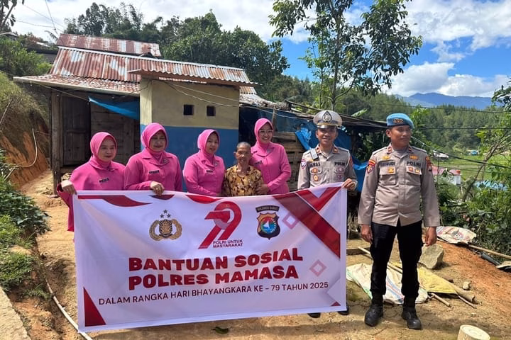 Mamasa, toBagoes Sulbar – Dalam rangka memperingati Hari Ulang Tahun (HUT) Bhayangkara ke-79, Persoenl SatLantas Polres Mamasa bersama Bhayangkari Cabang Mamasa melaksanakan kegiatan bakti sosial dengan menyalurkan bantuan sembako kepada masyarakat kurang mampu di wilayah Kabupaten Mamasa, pada Senin, 16 Juni 2025