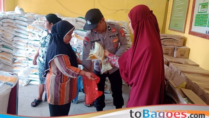 Polewali Mandar, toBagoes Sulbar – Bhabinkamtibmas Polsek Urban Wonomulyo, Bripka Abd. Wahab, menghadiri sekaligus mendampingi penyaluran bantuan pangan dari Badan Urusan Logistik (Bulog) kepada warga Desa Pasiang, Kecamatan Matakali, Kabupaten Polewali Mandar, Kamis (04/12/2025).