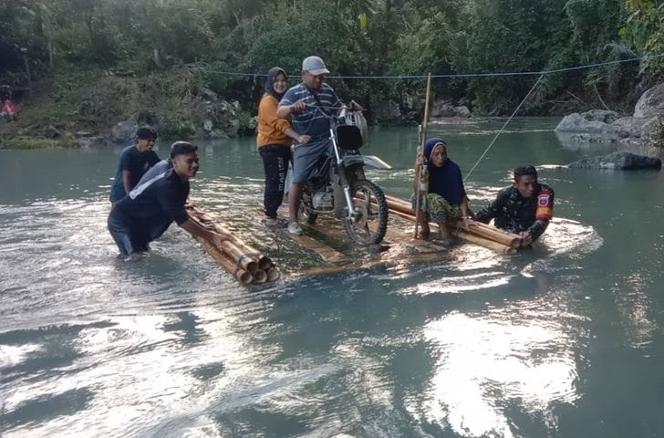 Pantauan di lokasi, rakit sederhana yang dirakit dari batang bambu ini kini digunakan warga untuk menyeberang, termasuk anak-anak sekolah dan pengendara motor.