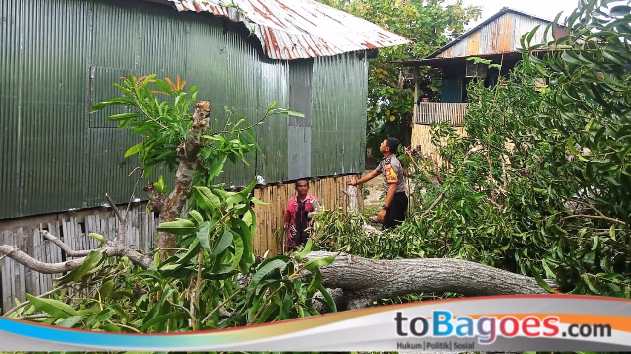 Majene, toBagoes Sulbar – Bhabinkamtibmas Polsek Banggae Polres Majene bergerak cepat menangani kejadian rumah warga yang tertimpa pohon tumbang akibat angin kencang di Lingkungan Paleo Tobandaq, Kelurahan Pangali Ali, Kecamatan Banggae, Kabupaten Majene, Minggu (11/1/2026) sore.