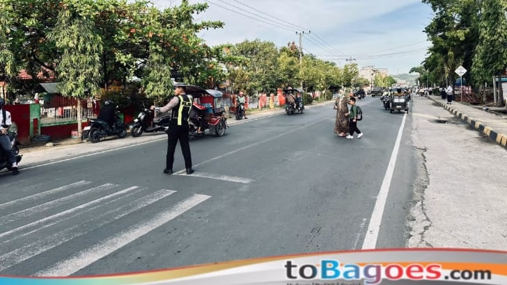 Dalam pelaksanaannya, personel Satlantas melakukan pengaturan arus lalu lintas, membantu penyeberangan pelajar dan masyarakat, serta memberikan imbauan agar pengguna jalan senantiasa tertib berlalu lintas.