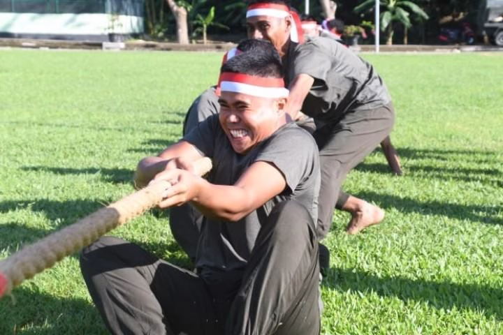 Aksi tarik menarik, adu kekuatan dan kekompakan ini diikuti oleh prajurit Korem 142/Tatag dan Balak Aju Korem 142/Tatag. Sorak sorai penonton mengiringi setiap pertandingan, menciptakan atmosfer persaudaraan yang hangat di tengah persaingan sportif.