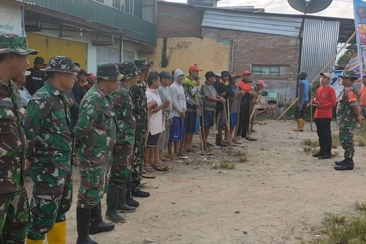 Pantauan di lokasi, anggota TNI dan warga tampak bahu-membahu mengangkat lumpur tebal dan sampah yang menumpuk di sepanjang saluran depan pertokoan. Aktivitas ini menjadi pemandangan penuh semangat kebersamaan di tengah kesibukan masyarakat pasar.