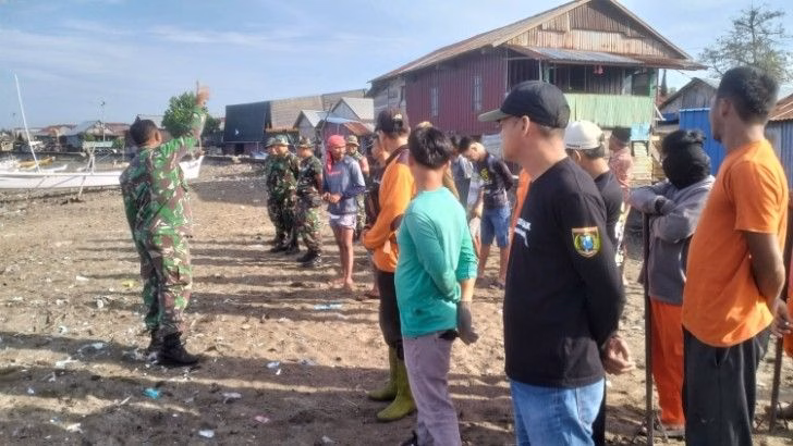 Polewali Mandar, toBagoes Sulbar – Sejumlah personel TNI dari Koramil 1402-01/Polewali bersama petugas Dinas Lingkungan Hidup dan Kebersihan (DLHK) serta masyarakat melaksanakan kerja bakti pembersihan lingkungan pesisir dan pantai di Kelurahan Takatidung, Kecamatan Polewali, Kabupaten Polewali Mandar, Selasa (12/8/2025).