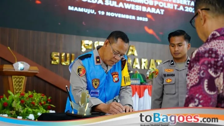 Mamuju, toBagoes Sulbar – Wakapolda Sulbar, Brigjen Pol Hari Santoso, memimpin acara sakral penandatanganan pakta integritas dan pengambilan sumpah bagi panitia, peserta, serta orang tua/wali pendaftar Bintara Brimob Polri T.A. 2026 yang berlangsung di Aula Marannu Mapolda Sulbar, Rabu (19/11/25).